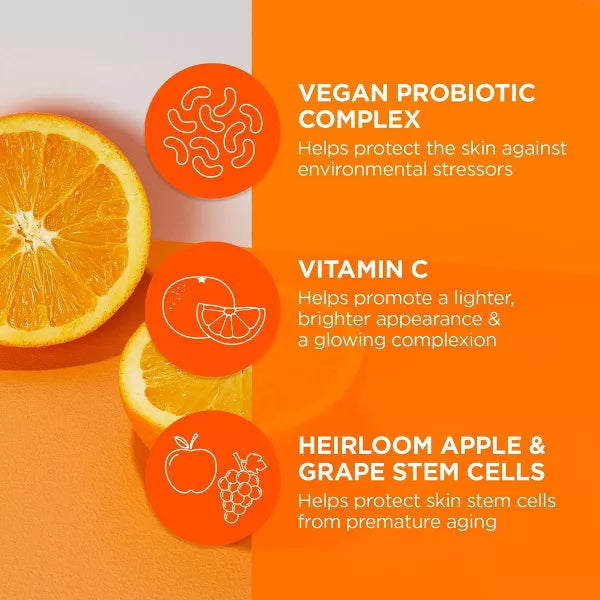 Probiotics help support skin health and vitality, while fruit stem cells and vitamin c help give skin a brighter, toned, and balanced appearance with a healthy looking glow.