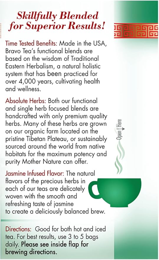 - Jasmine Infused Flavor: The natural flavors of the precious herbs in each of our teas are delicately woven with the smooth, refreshing flavor of jasmine flowers to create a deliciously balanced infusion every time you enjoy a cup of Bravo Tea.