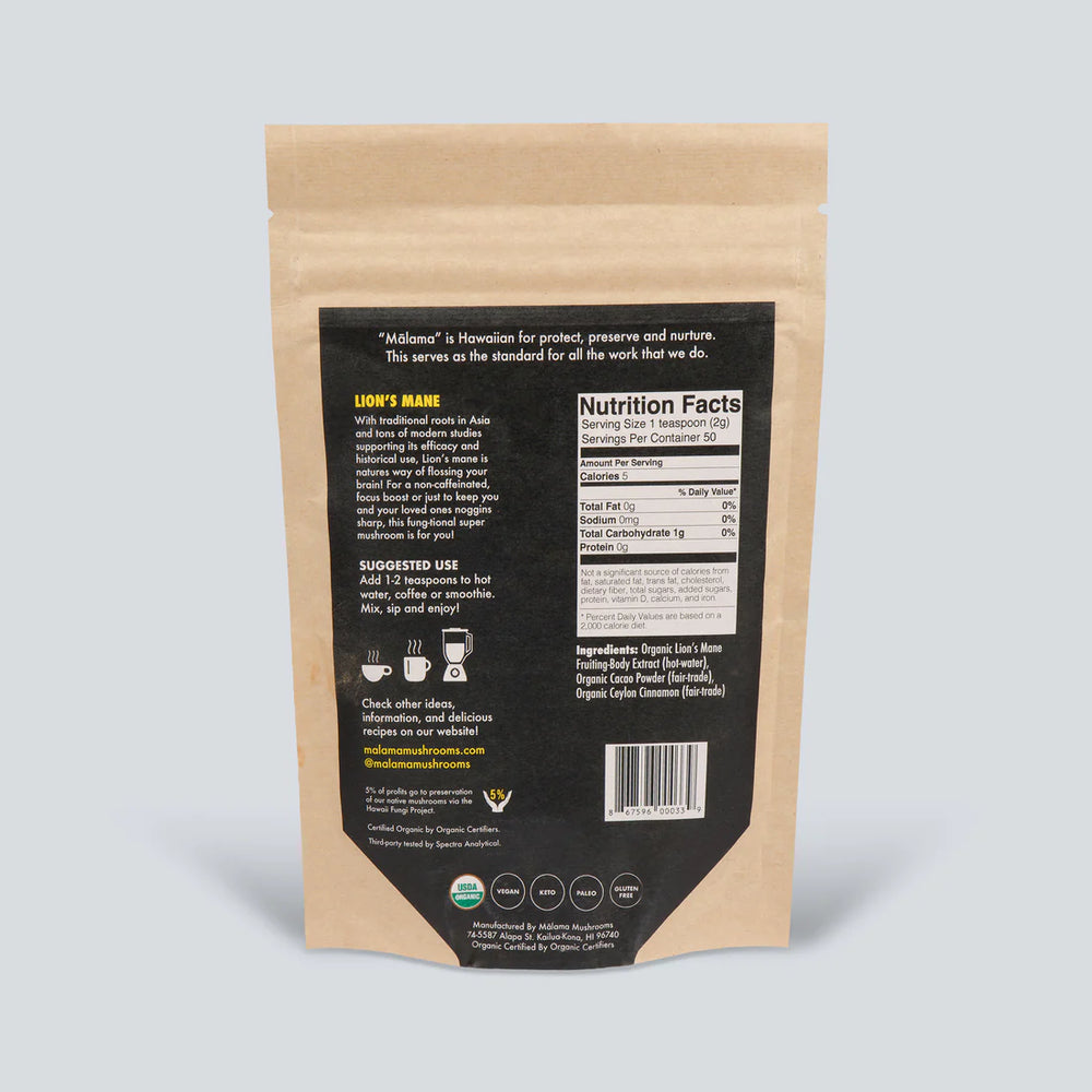 Superfood Mushroom LION'S MANE Cacao Mix - 100 G (3.5oz) is backordered and will ship as soon as it is back in stock.