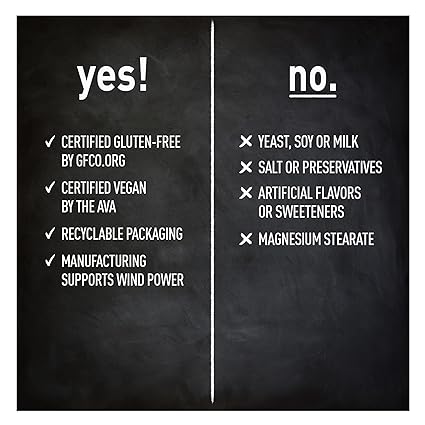 - Responsibly Made: Certified gluten-free and vegan, made with recyclable packaging, the manufacturing of this product supports wind power. This product does not contain yeast, corn, wheat, soy, milk, preservatives or artificial colors, flavors or sweeteners.