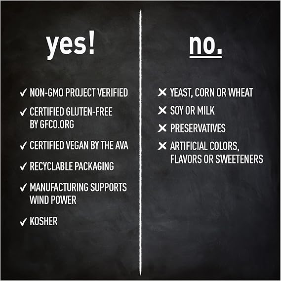 - Responsibly Made: Certified Non-GMO, Gluten-Free, Vegan, and Kosher, Made with recyclable packaging, The manufacturing of this product supports wind energy. This product does not contain yeast, corn, wheat, soy, milk, preservatives, or artificial colors, flavors, or sweeteners.