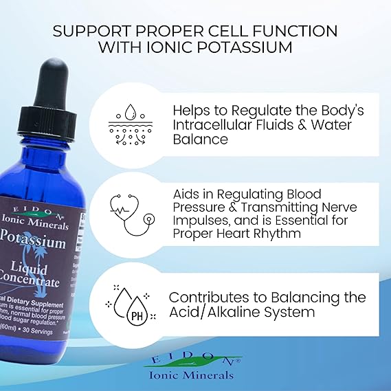 Eidon Potassium: As an essential electrolyte, potassium works with sodium, chloride, magnesium and calcium to regulate blood pressure and transmit nerve impulses. Potassium stimulates cellular contraction and is necessary for the proper balance and delivery of glucose into cells.