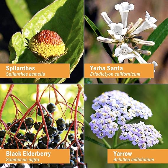 | Echinacea root (Echinacea purpurea) O F Goldenseal rhizome with rootlet (Hydrastis canadensis) O Osha root (Ligusticum porteri) W Spilanthes whole flowering plant (Spilanthes acmella) O F Yerba Santa leaf (Eriodictyon californicum) W Horseradish root (Armoracia rusticana) O Ginger rhizome (Zingiber officinale) O Black Elderberry fruit (Sambucus nigra)O Yarrow flowering top (Achillea millefolium) O W Wild Indigo root (Baptisia spp.) W F | ||