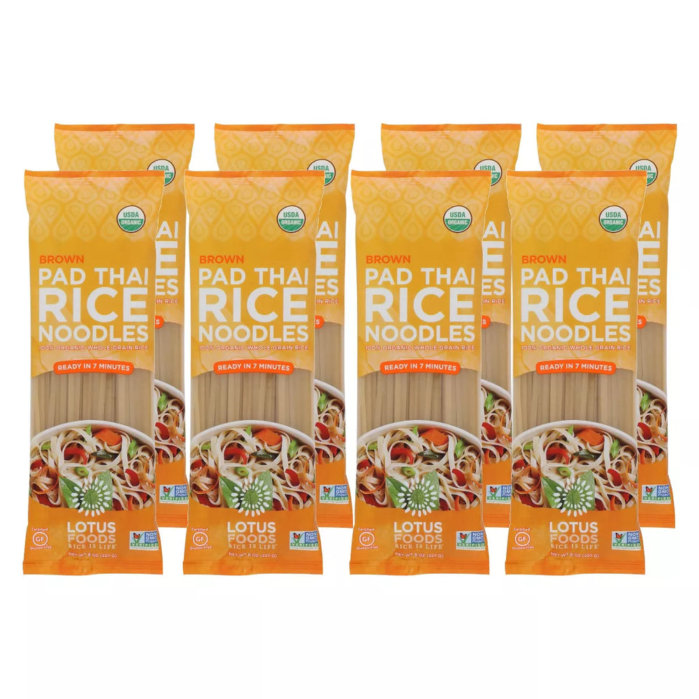 Lotus Foods Pad Thai Rice Noodles, Brown are authentic, traditional Pad Thai noodles. Made with organic brown rice, Lotus Foods noodles are free from unnatural and unnecessary ingredients or additives, so the noodles retain their own natural flavor. This product is gluten-free, Kosher, organic and vegan friendly. Each pouch of Lotus Foods Pad Thai Rice Noodles, Brown weighs 8 oz, with four servings per pouch and 200 calories per serving. Elevate your Pad Thai to the next level with the rich and delicious flavor of Lotus Foods Pad Thai Rice Noodles, Brown.