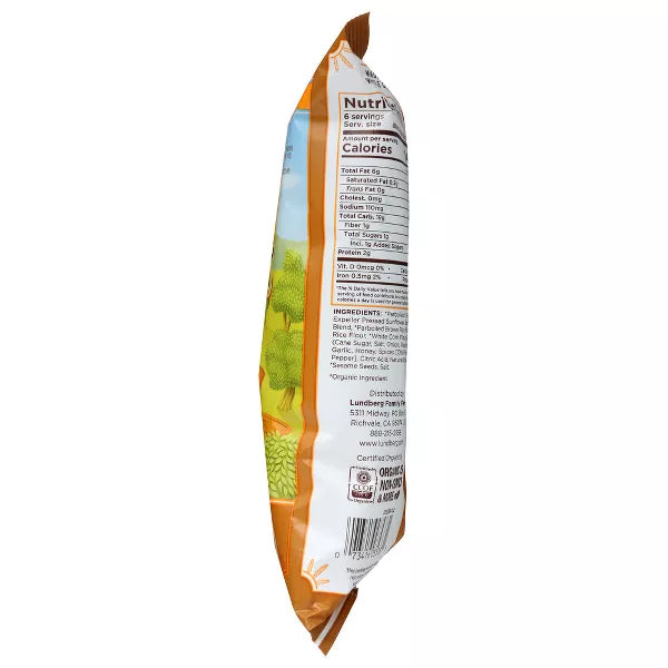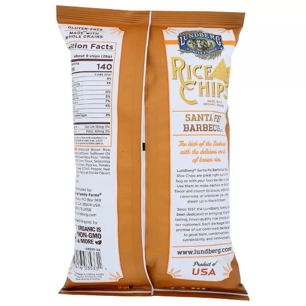 Lundberg Santa Fe Barbeque Rice Chips are made sustainably with all organic and Non-GMO Project Verified ingredients, including whole grain brown rice, whole grain corn masa flour, and sesame seeds. One 6 oz. bag of rice chips is gluten-free, Kosher, and made with whole grains for a healthy snack when you're on the run.