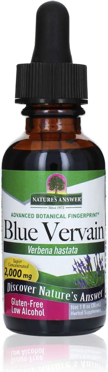 Natures Answer has offered top quality Blue Vervain, low Organic Alcohol (12-15%) since 1972 ! This product is gluten free, certified kosher, vegan, no animal testing and is prepared from 2000 mg of Verbena hastata per 2 ml dose.