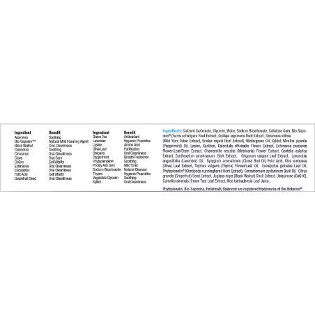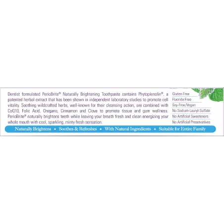 PerioBrite Wintermint Toothpaste contains Phytoplenolin®, a patented herbal extract that has been shown in independent laboratory studies to promote cell vitality. Soothing wildcrafted herbs, well-known for their cleansing action, are combined with CoQ10, Folic Acid, Oregano, Cinnamon and Clove to promote tissue and gum wellness.