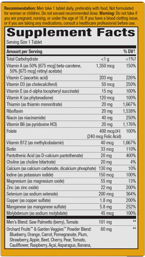 Contains unique food-based Orchard Fruits™ & Garden Veggies™ powder blend plus Men’s, Energy & Endurance, Cardio, Daily Greens™, Digestive Enzyme, Mushroom Mycelial & Primordia Biomass, and Citrus Bioflavonoid powder blends.