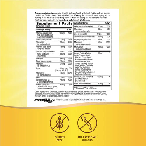 This complete multivitamin contains a unique Orchard Fruits & Garden Veggies™ powder blend (100mg per serving).