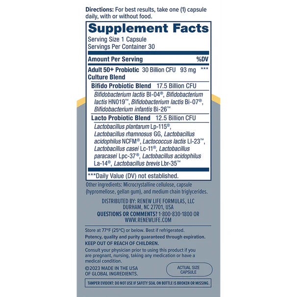 With 30 billion live cultures, Renew Life® Adult 50+ Probiotic seeds your gut with 12 probiotic strains to promote regularity and digestive balance—and provides bifidobacteria that decrease as you age.*