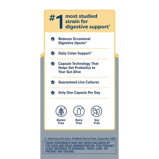 - Delayed-release, once-daily capsule with multiple clinically tested probiotic strains