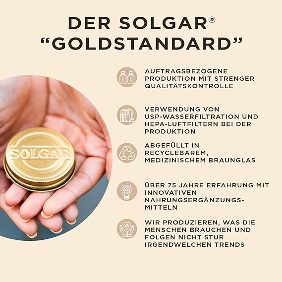 - The Gold Standard: For over 70 years, Solgar has been committed to quality, health and wellness. Our mission is to create the finest nutritional supplements in small batches, through tireless research, using only the finest raw materials.