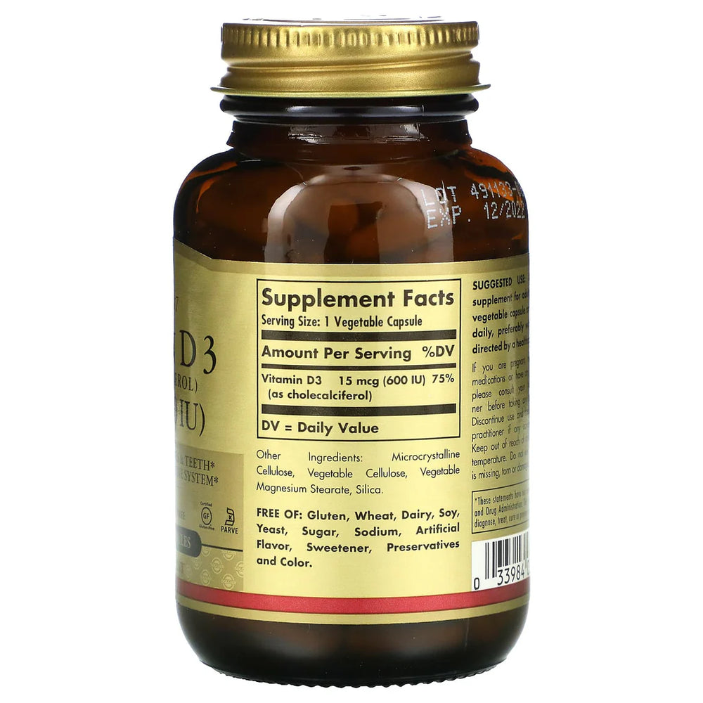 Solgar Vitamin D3 (Cholecalciferol) 15 mcg (600 IU) Vegetable Capsules 120V cap