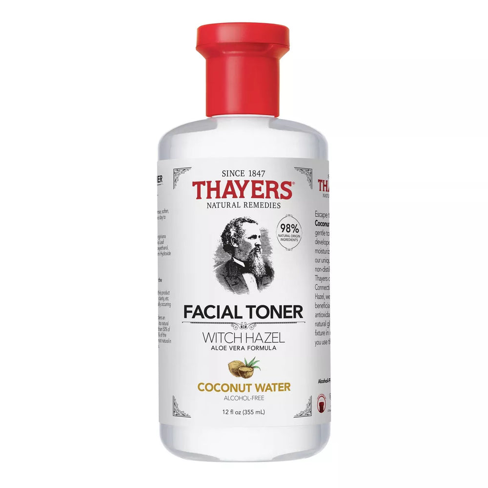 Escape to a tropical island. THAYERS Coconut Water Face Toner visibly improves the quality of skin, revealing glowy, moisturized skin that looks and feels healthier.  Our alcohol-free, gentle, non-drying skin toner acts like a remedy to hydrate skin all day, helping skin feel purified, balanced, and renewed. Skin texture is visibly smoother, pores appear smaller, and skin tone looks more even after using this witch hazel face toner.  Founded by Dr. Henry Thayer, Thayers Natural Remedies’ time-honored formula is made with Coconut Water and our unique, proprietary blend of Aloe Vera and non-distilled Witch Hazel, grown exclusively for Thayers on a family farm in Fairfield County, Connecticut.  Our method of extracting Witch Hazel avoids distillation and does not require the use of alcohol, ensuring that our Witch Hazel is alcohol-free.  Tried and true, Thayers Natural Remedies has been a fixture in medicine cabinets for generations – once you use them, you’ll know why.
