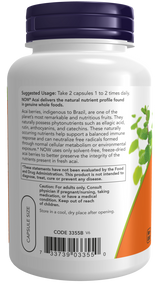 Acai berries, indigenous to Brazil, are one of the planet’s most remarkable and nutritious fruits. They naturally possess phytonutrients such as ellagic acid, rutin, anthocyanins, and catechins. These naturally occurring nutrients help support a balanced immune response and can neutralize free radicals formed through normal cellular metabolism or environmental exposure.* NOW uses only solvent-free, freeze-dried acai berries to better preserve the integrity of the nutrients present in fresh acai.