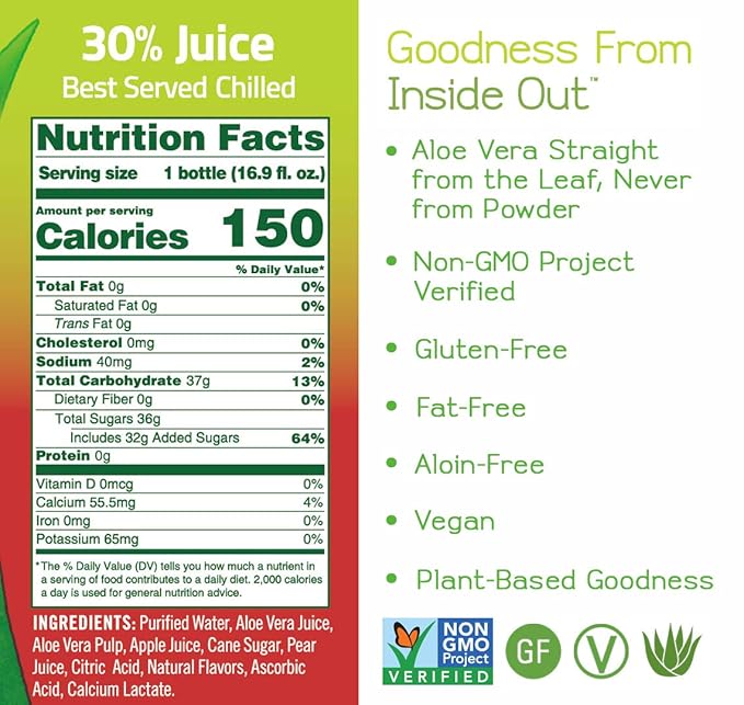 - With our real aloe vera juice with pulp, Fuji apples and juicy pears, your inner child will be