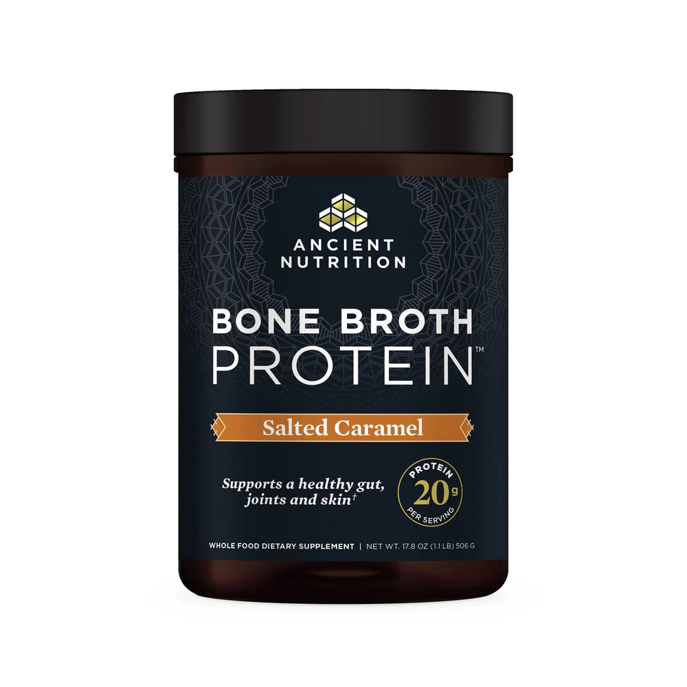 Ancient Nutrition's Bone Broth Protein Salted Caramel 20 serv is a full serving of protein in just 110 calories.
