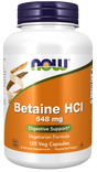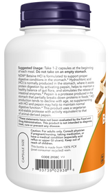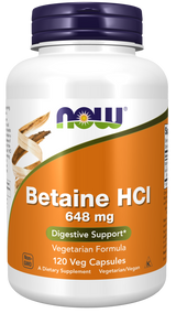 NOW® Betaine HCl is formulated to support proper digestive conditions in the stomach.* Hydrochloric acid (HCl) is normally produced in the stomach, where it assists protein digestion by activating pepsin, helps to maintain a healthy balance of gut flora, and stimulates the release of intestinal enzymes.* Pepsin is a protease produced in the stomach that partially breaks down proteins in foods.* HCl production tends to decline with age, so supplementing with HCl and pepsin may help to maintain normal digestive function.* This product uses a vegetarian acid-stable protease with activity equivalent to that of animal-derived pepsin.