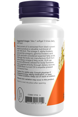 Black currant oil is extracted from black currant seeds to produce a valuable nutritional oil with 14% GLA. The omega-3, alpha-linolenic acid and the omega-6, gamma-linolenic acid (GLA), are both considered essential fatty acids. Although the body can manufacture GLA from other dietary omega-6 fatty acids, GLA can be more efficiently utilized for body functions when supplied directly through dietary sources. NOW® Black Currant Oil is expeller-pressed and hexane-free.