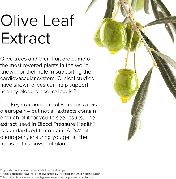 • Patented Olive Leaf Extract; Blood Pressure Health features a patented olive leaf extract, standardized to contain 16-24% oleuropein. In clinical tests, this standardized olive leaf extract was shown to support heart and cardiovascular health.