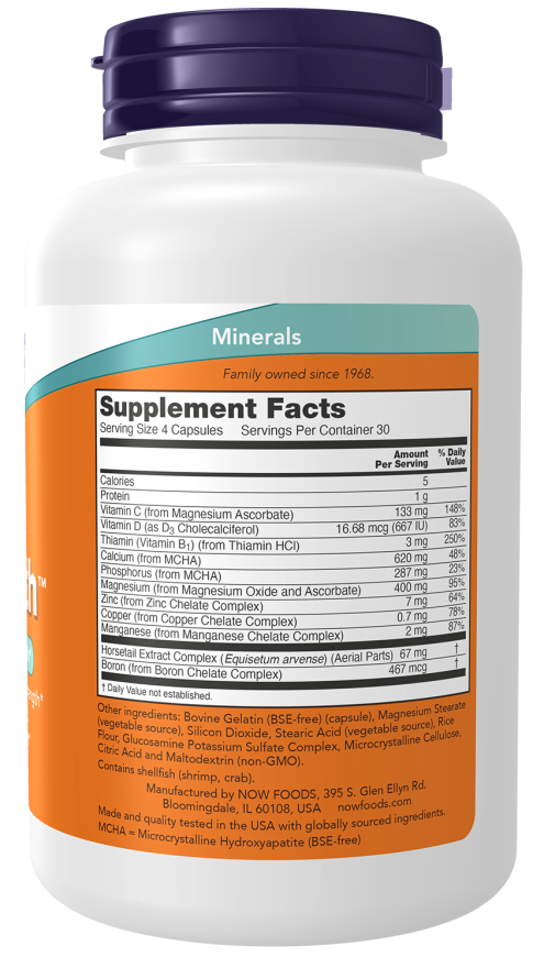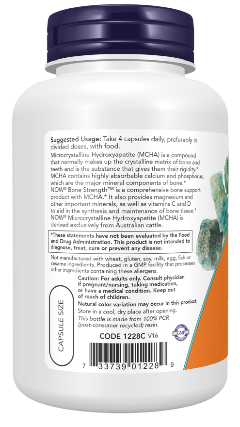 Microcrystalline Hydroxyapatite (MCHA) is a compound that normally makes up the crystalline matrix of bone and teeth and is the substance that gives them their rigidity.* MCHA contains highly absorbable calcium and phosphorus, which are the major mineral components of bone.* NOW® Bone Strength™ is a comprehensive bone support product with MCHA.* It also provides magnesium and other important minerals, as well as vitamins C and D to aid in the synthesis and maintenance of bone tissue.* NOW® Microcrystalline Hydroxyapatite (MCHA) is derived exclusively from Australian cattle.