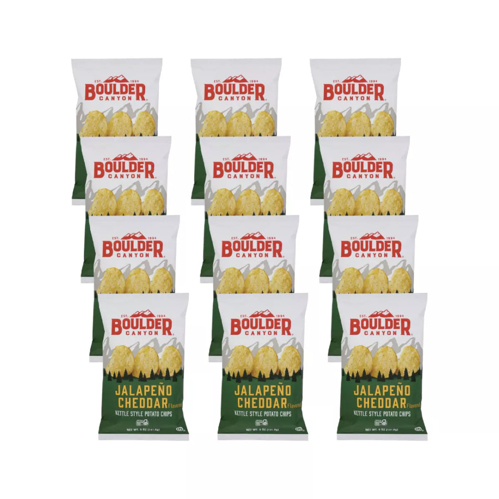 Spice up your snack time with Boulder Canyon Jalapeno Cheddar Kettle Style Potato Chips. Made with real jalapeno and cheddar flavors, these crunchy chips are perfect for those who enjoy a little kick in their snacks. Each chip is kettle-cooked to perfection, giving them a satisfying crunch with every bite. This case includes 12 bags of 5 oz chips, making it ideal for sharing with friends at parties or enjoying as a tasty treat on the go. Add some bold flavor to your snacking routine with Boulder Canyon Jalapeno Cheddar Kettle Style Potato Chips.