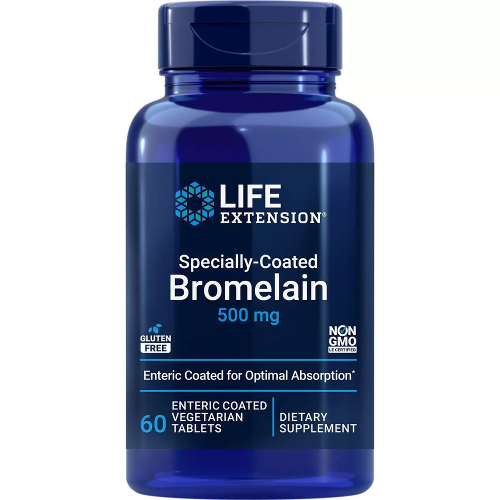 Specially Coated Bromelain 500 mg 60 Tablet Product DescriptionLife Extensions enteric-coated bromelain helps inhibit inflammation to support joint health and promotes joint comfort & function.Bromelain, a mixture of proteases extracted from the stem of the pineapple, inhibits inflammatory factors to support joint health. Bromelains fluid-regulating properties may result from its ability to inhibit inflammatory cytokine production, inhibit neutrophil migration and more.Specially-coated bromelain may significantly inhibit inflammatory reactions to support joint health. Research has demonstrated that enteric-coated bromelain formulations are at least as effective as other approaches in supporting joint comfort, function & health. One clinical study found that bromelain is more effective than other methods for maintaining joint function at rest.Specially-Coated Bromelain Benefits
