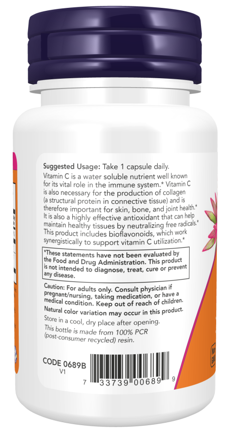Vitamin C is a water soluble nutrient well known for its vital role in the immune system.* Vitamin C is also necessary for the production of collagen (a structural protein in connective tissue) and is therefore important for skin, bone, and joint health.* Vitamin C is needed for amino acid metabolism, neurotransmitter synthesis, and the utilization of many nutrients, such as folic acid and iron.* It is also a highly effective antioxidant that can help maintain healthy tissues by neutralizing free radicals generated during normal metabolism and exposure to environmental stressors.* This product includes bioflavonoids, which work synergistically to support vitamin C utilization.*