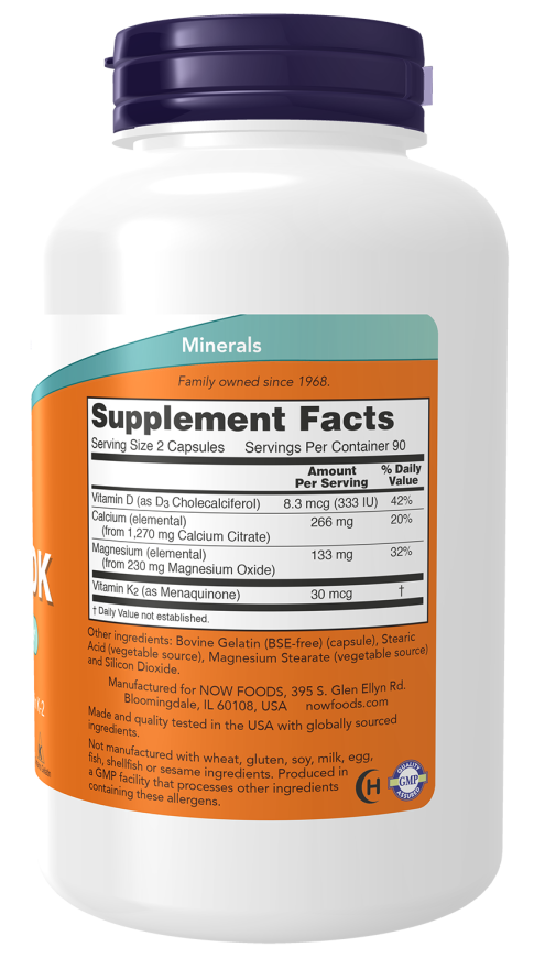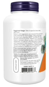 Calcium and magnesium are minerals that are known to be essential for bone health.* Along with these two important minerals, NOW® Cal-Mag DK Caps provide Vitamins D and K.* Vitamin D-3, a fat soluble vitamin, has been shown to play a critical role in bone metabolism, as well as in the absorption of calcium and magnesium in the intestine.* Vitamin K-2 is a nutrient that further supports bone health through its participation in healthy bone calcification.*