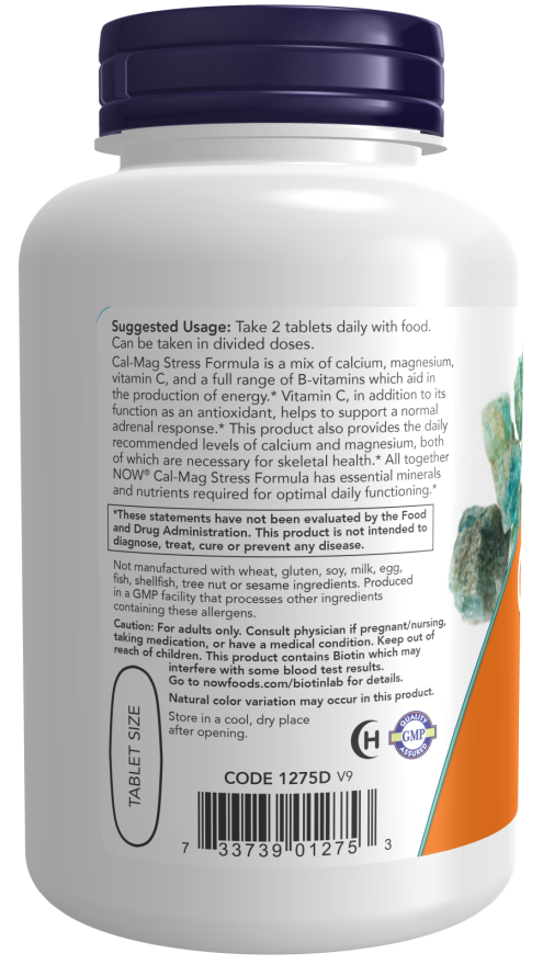Cal-Mag Stress Formula is a mix of calcium, magnesium, vitamin C, and a full range of B-vitamins which aid in the production of energy.* Vitamin C, in addition to its function as an antioxidant, helps to support a normal adrenal response.* This product also provides the daily recommended levels of calcium and magnesium, both of which are necessary for skeletal health.* All together NOW® Cal-Mag Stress Formula has essential minerals and nutrients required for optimal daily functioning.*