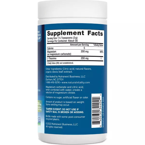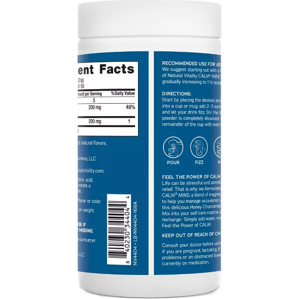Natural Vitality CALM Mind Magnesium Supplement Drink Mix is a convenient powder drink mix with L-theanine to help you manage occasional stress (1). Formulated with magnesium carbonate and citric acid, Natural CALM magnesium powder combines with water to create a magnesium citrate solution, which is better absorbed than magnesium oxide. With a blend of 200 mg magnesium and 200 mg L-theanine in each serving, this magnesium CALM powder helps you manage occasional stress, release tension from your body and calm your mind (1). These vegan, gluten free magnesium supplements have a delicious honey chamomile taste and contain no sugar, artificial flavor or synthetic color. Simply mix this powder drink mix with water for a fizzy beverage you can enjoy hot, cold, day, night or anytime you could use a calm, self-care moment. (1) These statements have not been evaluated by the Food and Drug Administration. This product is not intended to diagnose, treat, cure or prevent any disease. Usage Directions: RECOMMENDED USE FOR ADULTS: We suggest starting out with a half teaspoon (1 g) of Natural Vitality CALM® MIND powder, and gradually increasing to 1 ½ teaspoons (3 g) daily. DIRECTIONS: Start by placing the desired amount of powder into a cup or mug, add 2–3 ounces of warm water, and let your drink fizz. Stir the drink until the powder is completely dissolved, then fill the remainder of the cup with warm or cold water. Caution Statement: KEEP OUT OF REACH OF CHILDREN Consult your doctor before using this product if you are pregnant, lactating, if you have kidney problems or an obstructed bowel, or if you are currently on medication. TAMPER EVIDENT: DO NOT USE IF SAFETY SEAL IS BROKEN OR MISSING.