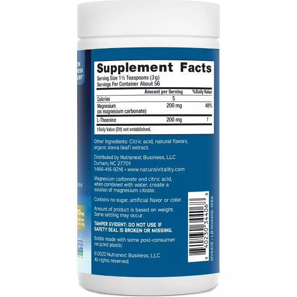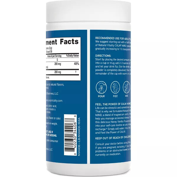 Natural Vitality CALM Mind Magnesium Supplement Drink Mix is a convenient powder drink mix with L-theanine to help you manage occasional stress (1). Formulated with magnesium carbonate and citric acid, Natural CALM magnesium powder combines with water to create a magnesium citrate solution, which is better absorbed than magnesium oxide. With a blend of 200 mg magnesium and 200 mg L-theanine in each serving, this magnesium CALM powder helps you manage occasional stress, release tension from your body and calm your mind (1). These vegan, gluten free magnesium supplements have a delicious honey vanilla taste and contain no sugar, artificial flavor or synthetic color. Simply mix this powder drink mix with water for a fizzy beverage you can enjoy hot, cold, day, night or anytime you could use a calm, self-care moment. (1) These statements have not been evaluated by the Food and Drug Administration. This product is not intended to diagnose, treat, cure or prevent any disease.