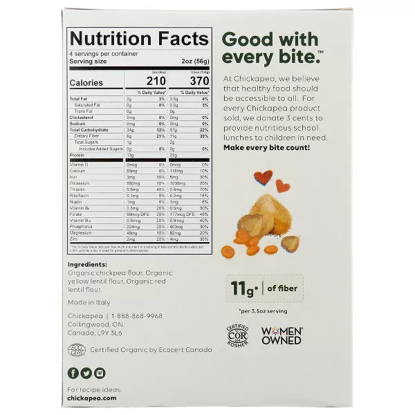 Introducing Chickapea Pasta Elbows, the healthier way to indulge in your favorite pasta dishes. This case of six 8-ounce packages is the perfect addition to your pantry, providing a nutritious and high-protein meal option. Made with organic chickpeas and lentils, Chickapea offers 2x protein, 3x fiber, and 30% fewer net carbs compared to the leading white semolina pasta brands (per 3.5oz serving), making it a healthier option for those looking to maintain a balanced diet. Each serving provides 23g of protein, 11g of fiber, and an abundance of essential nutrients, making it a wholesome and complete meal on its own. Chickapea Pasta Elbows are versatile and can be paired with any of your favorite healthy sauces, vegetables, or proteins. Don't compromise on taste or nutrition, choose Chickapea Pasta Elbows for a healthier way to enjoy your favorite pasta dishes.