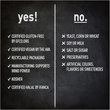 - Certified - Gluten Free Certified by GFCO, Vegan Certified by AVA, Halal Certified by IFANCA