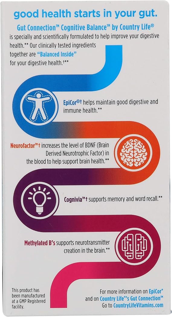 - Committed to Satisfaction: Country Life honors the best practice method when it comes to our manufacturing process. Our Gut Connection Cognitive Balance helps support a healthy shift in gut microbiota composition. All of our Gut Connection products help maintain the composition and function of the intestinal barrier.