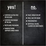 - Non-GMO. Also not - yeast - wheat - soy - milk - salt - sugar - preservatives - artificial colors - artificial flavors - artificial sweeteners.