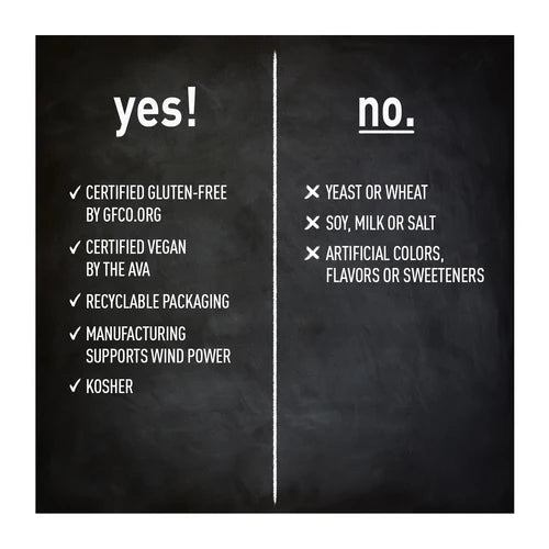 - Responsibly Made: Certified Non-GMO, Gluten-Free, Vegan, and Kosher Made with recyclable packaging, the manufacturing of this product supports wind power. This product does not contain yeast, wheat, soy, milk, salt, preservatives or artificial colors, flavors or sweeteners.