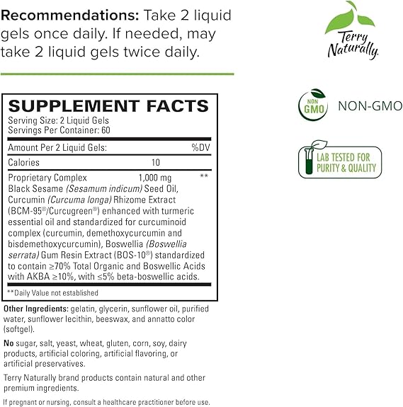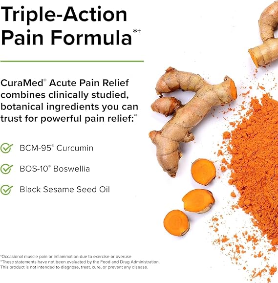 - Triple Action Formula: Terry Naturally CuraMed Acute Relief combines BCM-95 Curcumin, BOS-10 Boswellia, and Black Sesame Seed Oil for powerful relief.