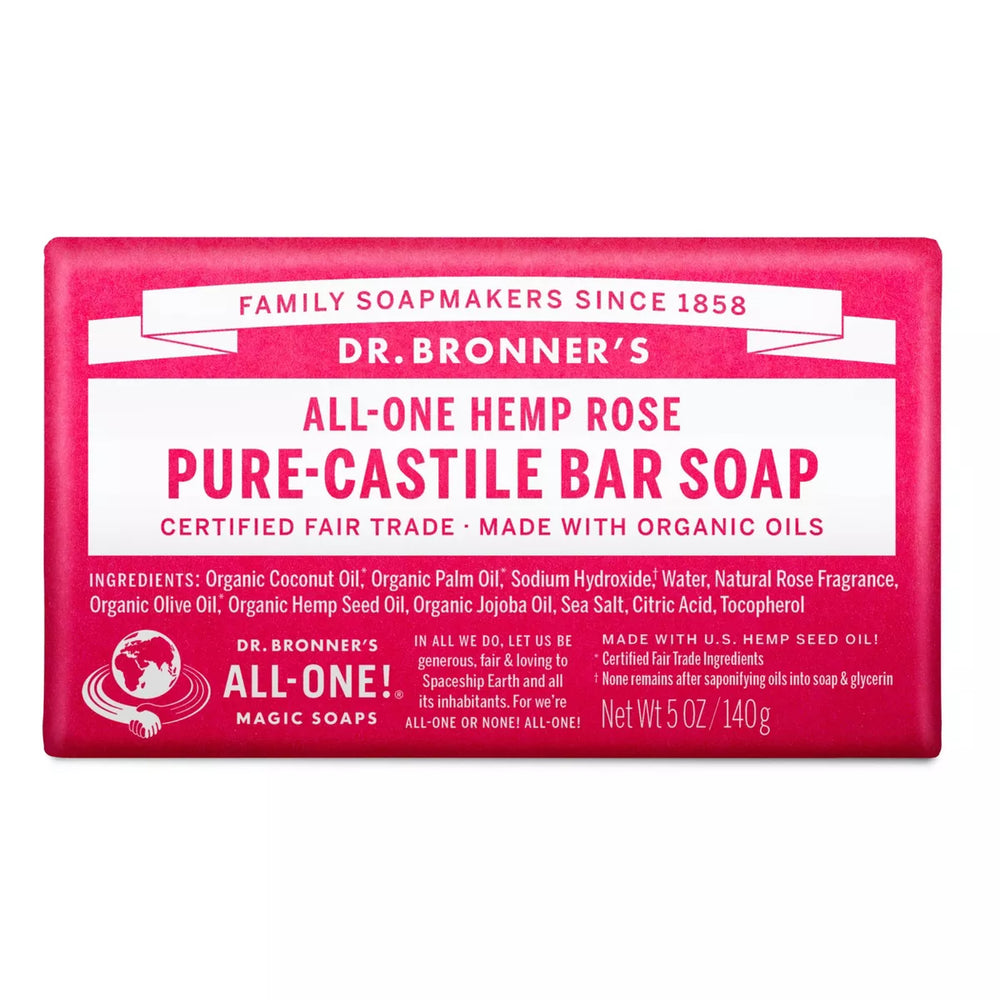 Dr. Bronner's Rose Pure-Castile Bar Soap! Floral and fresh, with a hint of sweetness! Our Rose Pure-Castile Bar Soap is made with certified fair trade ingredients and organic hemp oil for a soft, smooth lather that won't dry your skin. Readily biodegradable and packaged in a 100% post-consumer recycled paper wrapper. Dr. Bronner's Pure-Castile Bar Soaps are 100% cruelty-free, vegan, gentle, and versatile. With no synthetic preservatives, detergents, or foaming agents, they're even gentle enough for sensitive skin. They will leave your skin feeling soft, smooth, hydrated, and moisturized. All-One! Packaging contains recycled content