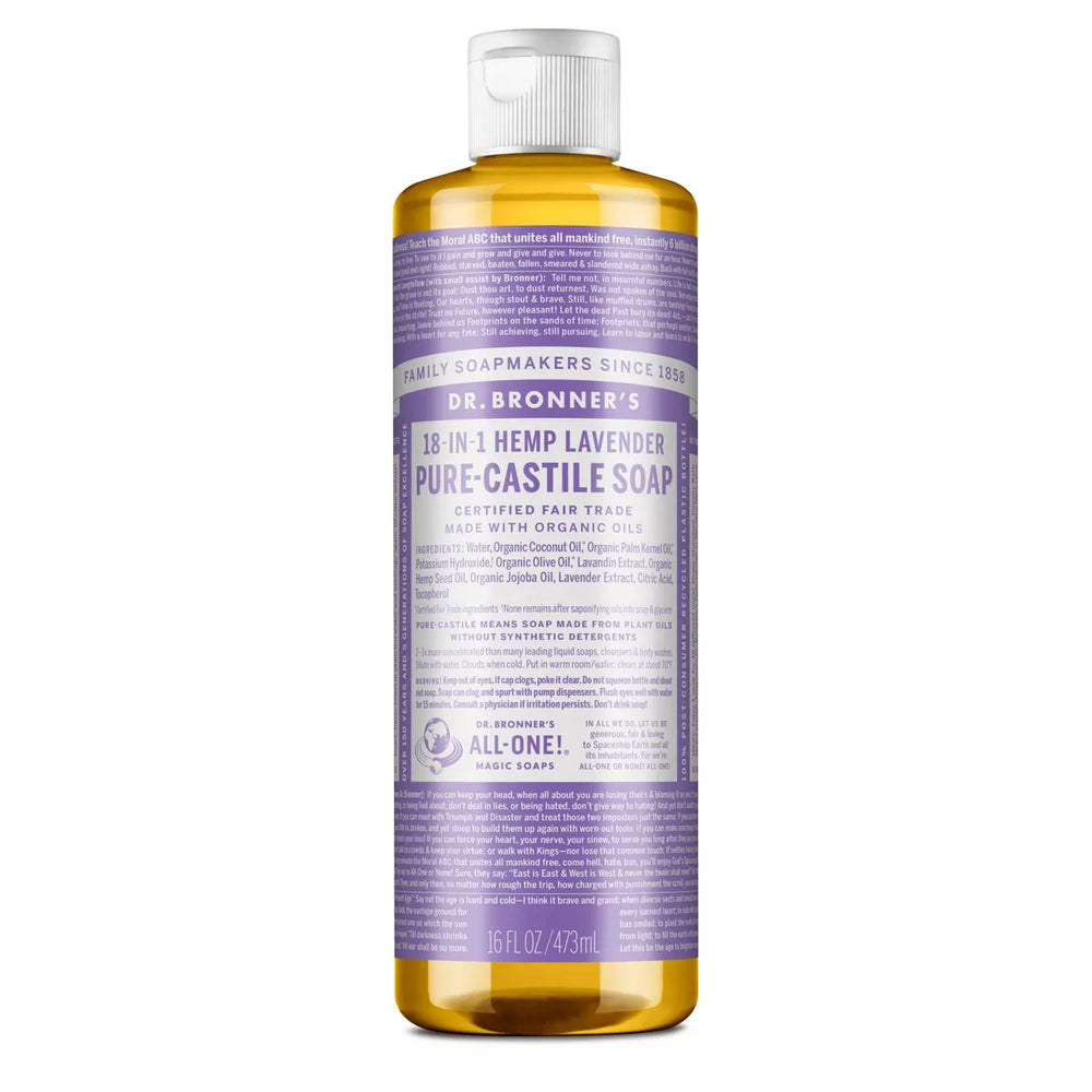 Dr. Bronner's Pure-Castile Lavender Liquid Soap! Scented with pure lavender and lavandin oils to calm the mind and soothe the body! Dr. Bronner's Pure-Castile Liquid Soaps are concentrated, readily biodegradable, versatile and effective. With 18-in-1 uses, these soaps are perfect for your face, body, and hair, but can also be used for rinsing food, cleaning dishes, mopping, and doing laundry. No synthetic preservatives, detergents, or foaming agents – none! Never tested on animals and completely cruelty-free. Made with organic and certified fair trade ingredients, packaged in a 100% post-consumer recycled bottle. All-One!