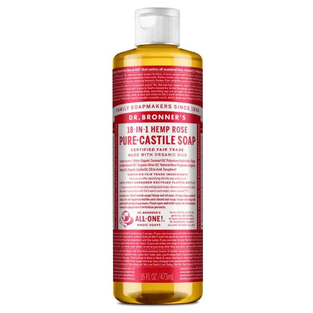 Dr. Bronner's Pure-Castile Rose Liquid Soap! Floral and fresh, with a hint of sweetness. Dr. Bronner's Pure-Castile Liquid Soaps are concentrated, readily biodegradable, versatile and effective. With 18-in-1 uses, these soaps are perfect for your face, body, and hair, but can also be used for rinsing food, cleaning dishes, mopping, and doing laundry. No synthetic preservatives, detergents, or foaming agents – none! Never tested on animals and completely cruelty-free. Made with organic and certified fair trade ingredients, packaged in a 100% post-consumer recycled bottle. All-One!