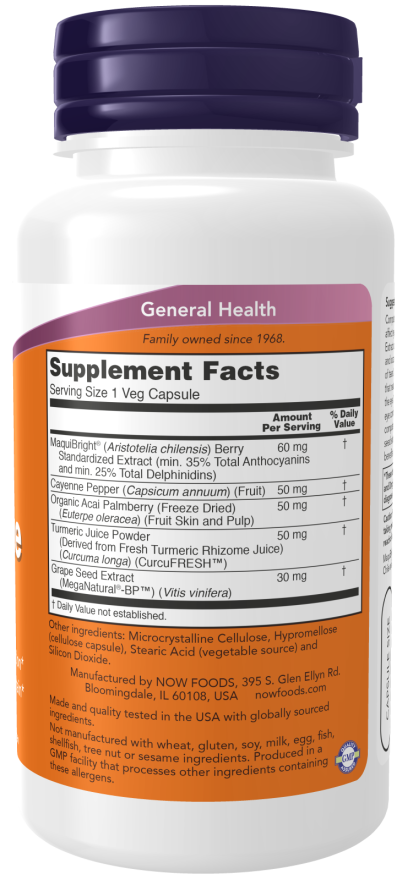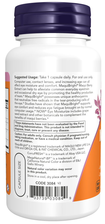 Computer use, contact lenses, and increasing age can all affect eye moisture and comfort. MaquiBright® Maqui Berry Extract can help to alleviate common everyday eyestrain and occasional dry eye by promoting the healthy production of tears.* MaquiBright® possesses unique anthocyanins that neutralize free radicals in the tear-producing cells of the eye.* Studies have shown that MaquiBright® supports eye comfort and reduces eye fatigue brought on by normal computer usage.* NOW® Eye Moisturize includes grape seed extract and other botanicals to complement the benefits of maqui berries.*
