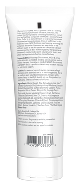 Ingredients: Water (Aqua), Aloe Barbadensis Leaf Juice*, Dimethyl Sulfone (MSM) (Methylsulfonyl Methane), Cetearyl Alcohol, Glucosamine Sulfate (shellfish), Glycerin, Prunus Amygdalus Dulcis (Sweet Almond) Oil, Caprylic/Capric Triglyceride, Arnica Montana Flower Extract, Carthamus Tinctorius (Safflower) Seed Oil, Stearic Acid (vegetable source), Ceteareth-20, Limnanthes Alba (Meadowfoam) Seed Oil, Tocopheryl Acetate (Vitamin E) (soy), Phosphatidylcholine (Phospholipids) (soy), Camellia Sinensis (Green Tea) Leaf Extract, Natural Hinokitiol, Xanthan Gum. *Certified Organic