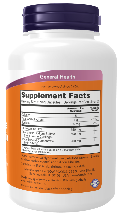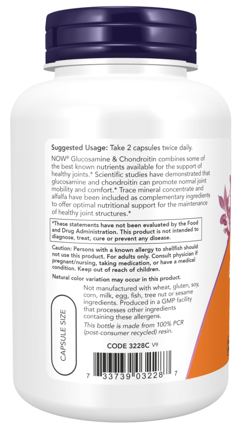 NOW® Glucosamine & Chondroitin combines some of the best known nutrients available for the support of healthy joints.* Scientific studies have demonstrated that glucosamine and chondroitin can promote normal joint mobility and comfort.* Trace mineral concentrate and alfalfa have been included as complementary ingredients to offer optimal nutritional support for the maintenance of healthy joint structures.*