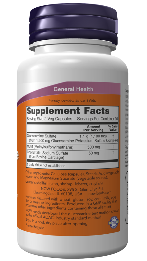 NOW® Glucosamine & MSM with Chondroitin Sulfate combines three well-known joint support ingredients.* Glucosamine is an essential building block for the formation of glycosaminoglycans (GAGs) and proteoglycans, the main components of cartilage tissue.* These compounds promote water retention within the joint, giving it resiliency by acting as a lubricant and a means to absorb shock.* MSM (Methylsulfonylmethane) is an organic form of sulfur, a mineral necessary for the production of GAGs and proteoglycans.*
