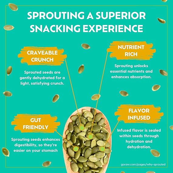 - Packed with flavor and stacked with nutrients: Crunchy and tasty blend of sprouted pumpkin and sunflower seeds with 0.23 oz of protein/serving. Sweet and salty in perfect harmony make these snack seeds deliciously addictive. Crunchy and tasty, they are the perfect snack to satisfy your cravings and enjoy by the handful.