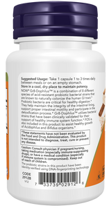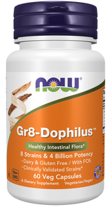 NOW® Gr8-Dophilus™ is a combination of 8 different species of acid-resistant probiotic bacterial strains that are known to naturally colonize the human GI tract.* Probiotic bacteria are critical for healthy digestion.* They help maintain the integrity of the intestinal lining, support proper intestinal motility and participate in the detoxification process.* Gr8-Dophilus™ utilizes bacterial strains that have been clinically validated for their support of healthy immune system function.* FOS is also included in this product to assist healthy growth of Acidophilus and Bifidus organisms.*