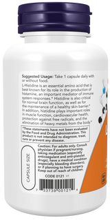 L-Histidine is an essential amino acid that is best known for its role in the production of histamine, an important mediator of immune system responses.* Histidine is also critical for normal brain function, as well as for the maintenance of a healthy skin barrier.* In addition, histidine plays important roles in muscle function, cardiovascular health, protection against free radicals, and the elimination of heavy metals from the body.*