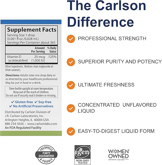 - Bone Health: Carlson's Vitamin D3 Drops are the preferred form of Vitamin D which is important for promoting strong, healthy bones.