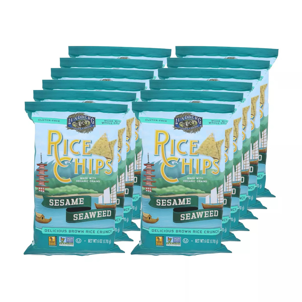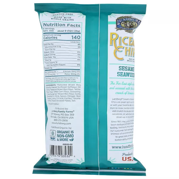 Lundberg' Sesame Seaweed Rice Chips have a Far East flavor with the delicious crunch of brown rice. They make a great snack right out of the bag or paired with salsa or your favorite dip. Use them to make nachos or to add flavor and crunch to soups, salads, and casseroles. As a healthier alternative, these rice chips will leave you feeling pleased and satisfied without the guilt that comes with snacking on potato chips. Since 1937, Lundberg has been dedicated to bringing the best-tasting, finest-quality rice products to their customers. Includes one 6 oz. bag (6 servings) of rice chips.